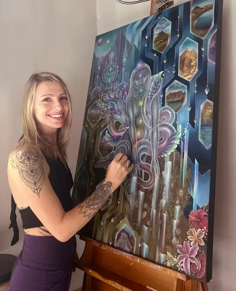 Through meditation and free-flow movement, she traverses the realms of Spirit, returning with images embedded with light codes and guardians of awakening.